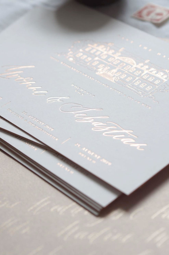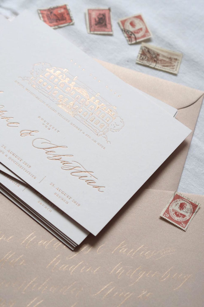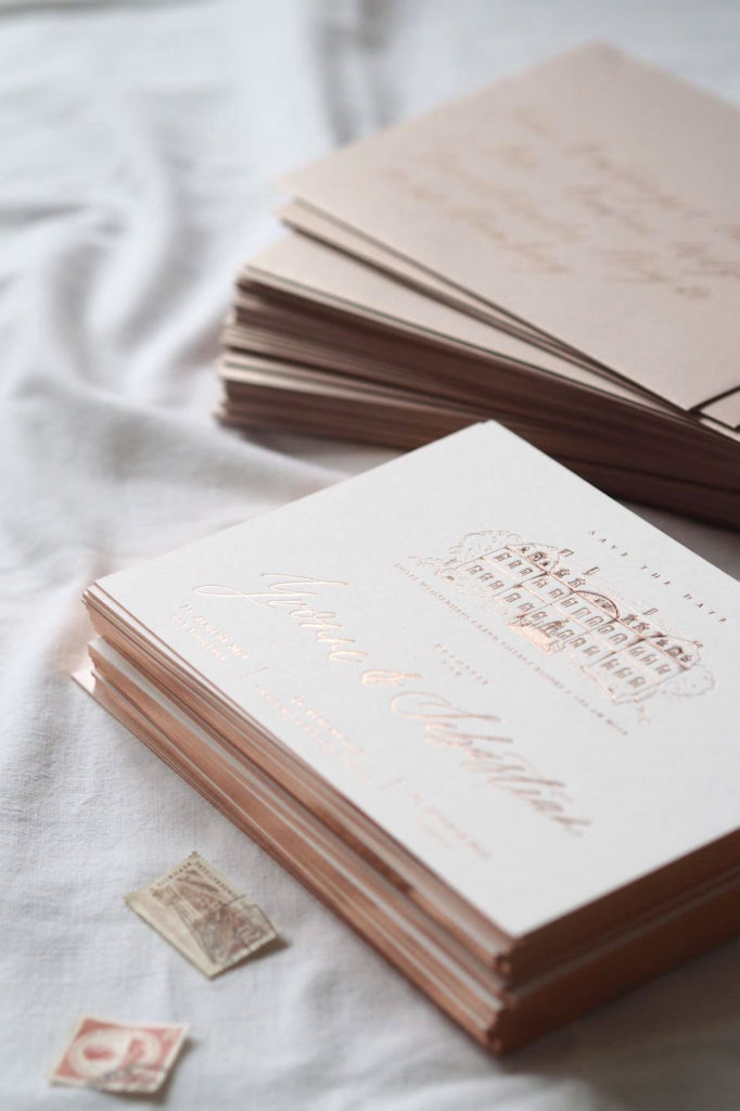 Hier übrigens ein paar Fotos von Save-the-Date-Karten, die ich gerade in Zusammenarbeit mit der zauberhaften Nicole Sprekelmann von Nicnillas Ink und meinen Kunden habe entworfen habe – Top Trends in der Papeterie: Letterpress, Goldfoliendruck, Kalligraphie.